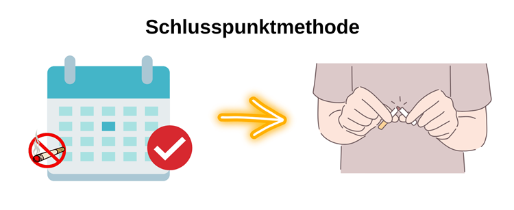 Die Methode, die deutlich mehr Erfolg beim Rauchen aufhören verspricht, ist die Schlusspunktmethode. Bei der Schlusspunktmethode hörst du von einem auf den anderen Tag mit dem Rauchen auf. Etwa 80 bis 90% der ehemaligen Raucher, die seit längerem Nichtraucher sind, haben es mit dieser Methode geschafft, mit dem Rauchen aufzuhören (Quelle: Wikipedia). Diese Methode ist so erfolgsversprechend, weil du dich hier nicht mit der Zigarette belohnst, sondern du schließt mit ihr ab. Dafür kannst du ein Datum festlegen und bis zu diesem Datum alle Vorbereitungen treffen, um mit dem Rauchen aufzuhören.