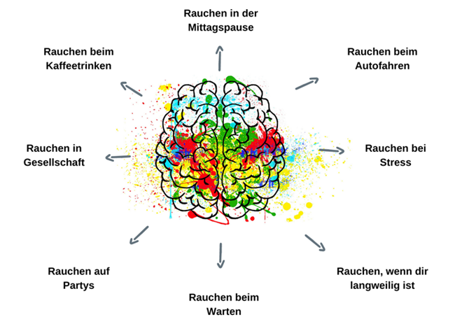 Darüber hinaus gibt einem Raucher das Rauchen ein Wohlfühlgefühl. Durch die Zigarette wird nämlich Dopamin ausgeschüttet, was das Belohnungszentrum stimuliert und auch Adrenalin. Für den Moment sinkt der Stresslevel und man verspürt ein gewisses Wohlfühlgefühl. Zusätzlich verbinden wir das Rauchen mit bestimmten Situationen, und daher wird in diesen Situationen die Zigarette automatisch angezündet. Bleibt der Dopaminschub in diesen Situationen aus, fehlt dem Körper etwas. Es hat sich über Jahre und Jahrzehnte eine psychische Abhängigkeit von der Zigarette gebildet.
