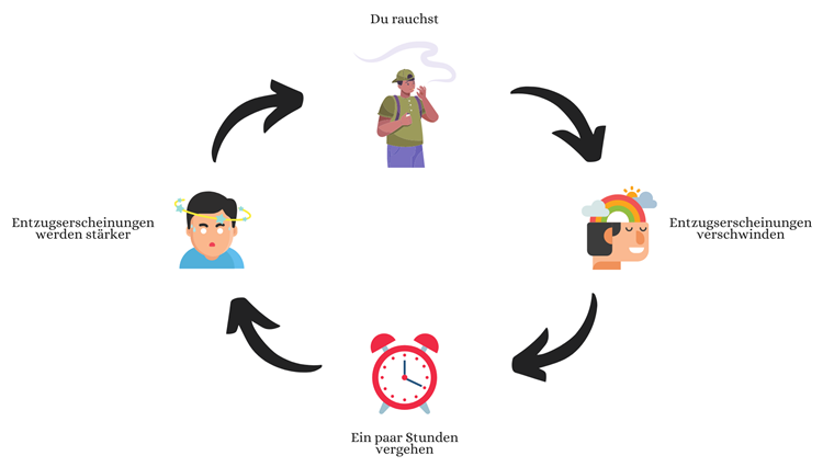 Nikotin erreicht das Gehirn innerhalb weniger Sekunden, aber es wird schnell vom Körper abgebaut, weil es ein Nervengift ist und verliert dementsprechend seine Wirkung. Und je länger du nach deiner letzten Zigarette nicht rauchst, desto unwohler fühlst du dich, bis du diesen Schub von Glücksgefühlen und Adrenalin wieder erleben möchtest. Ab da befindest du dich im Teufelskreis der Lust.